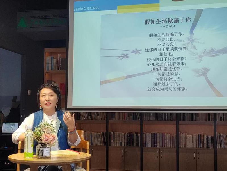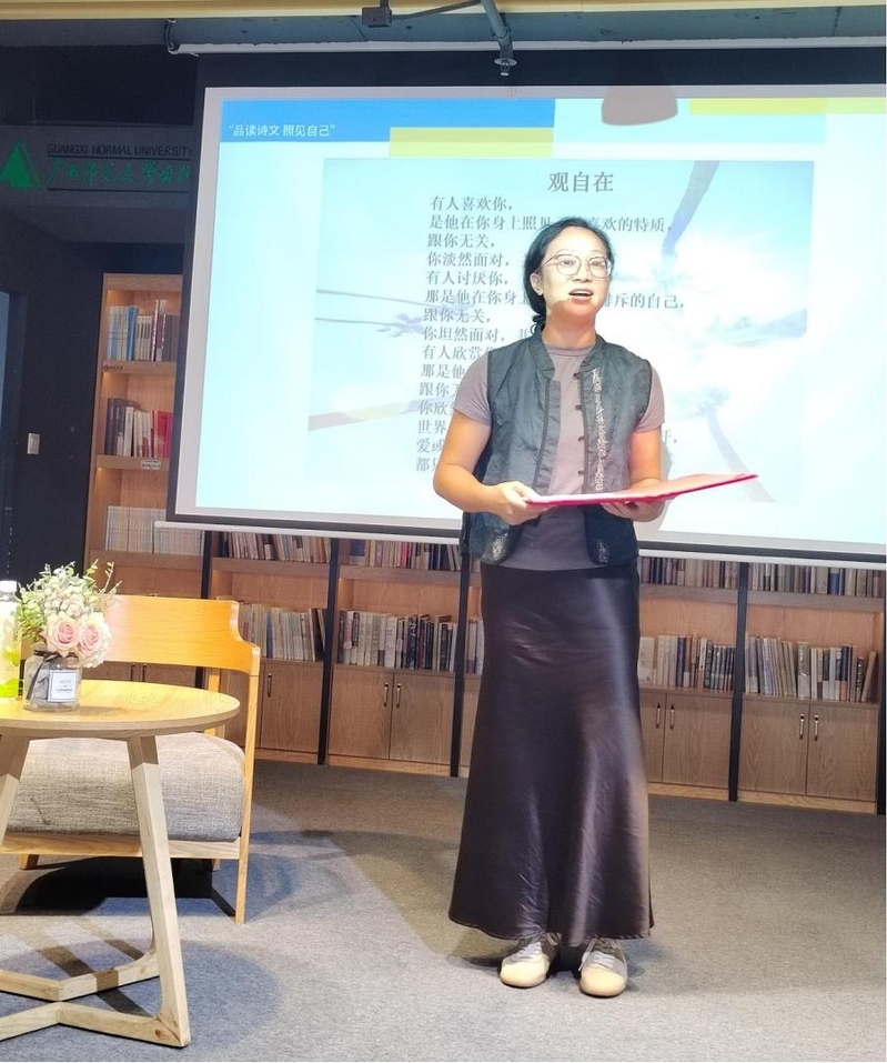 2025年10月10日下午,校工会在育才校区独秀书房举办“品读诗文 照见自己”诗歌朗诵疗愈活动。在领诵导师的带领下,教职工们参与了沉浸式的共读与分享活动。