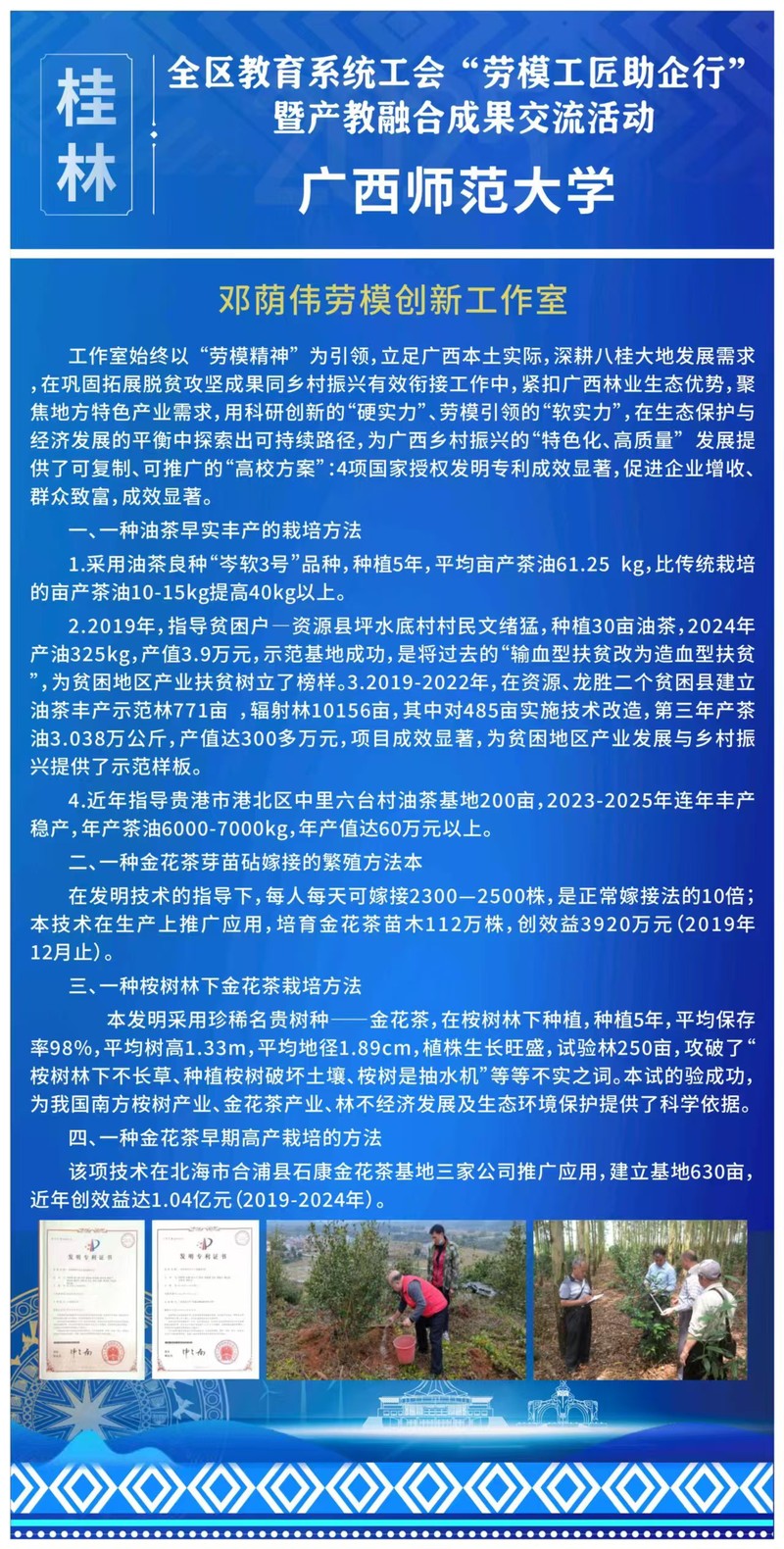 交流中,我校生命科学学院邓荫伟 “劳模工匠人才创新工作室” 的实践成果成为亮点。该工作室立足广西本土实际,紧扣八桂大地林业生态优势与特色产业发展需求,在巩固拓展脱贫攻坚成果同乡村振兴有效衔接的关键领域精准发力,以科研创新 “硬实力” 与劳模引领 “软实力” 为支撑,在生态保护与经济发展的平衡中探索出可持续发展路径。工作室研发的4项国家授权发明专利成功落地转化,有效助力企业增收、带动群众致富,为广西乡村振兴 “特色化、高质量” 发展提供了可复制、可推广的“高校方案”,相关成果同步在活动展板中展出,充分展现了我校服务地方经济社会发展的责任担当。