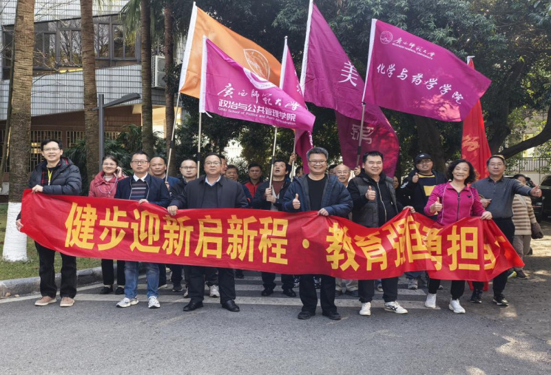 环校健步走的路上,伴随着铿锵有力的进行曲音乐,教职工精神抖擞,步伐坚定,秩序井然。沿途各学院的旗帜飘扬,欢声笑语不断,展现了我校教职工乐观团结、积极进取的精神风貌。校园里溢着一派喜迎新春、奋发向上的勃勃生机。