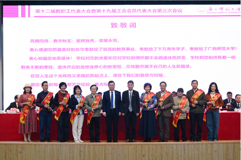 会议表彰了十二届二次教代会“优秀提案”和“提案承办先进单位”,为2025年3月-2026年3月退休的教职工代表举行光荣退休仪式;贺祖斌、孙杰远为获奖部门代表和获奖者颁奖,为退休的教职工代表颁发“光荣退休纪念杯”。